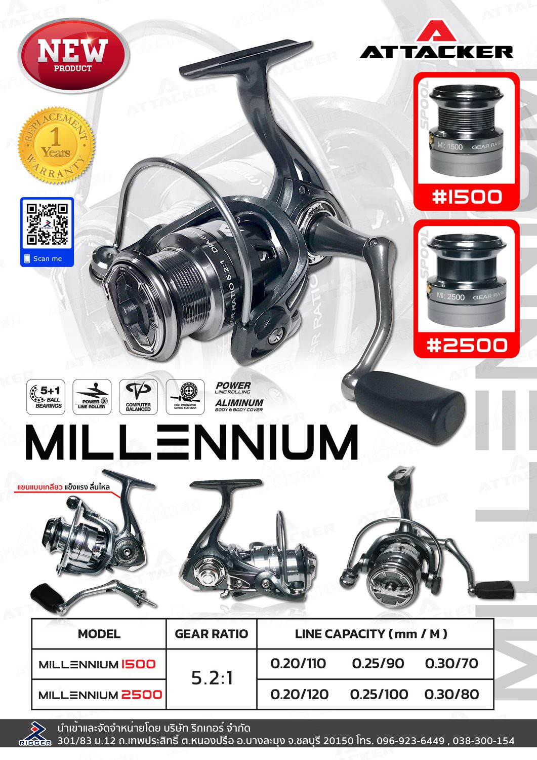 รอกตกปลาแบบสปินนิ่งรุ่นใหม่จากค่าย ATTACKER MILLENNIUM ที่มาพร้อมกับการพัฒนาใหม่ด้วย แขนมือหมุนแบบเกลียวที่แข็งแรงยิ่งขึ้นผนวกกับน๊อบที่ใหญ่จับถนัดมือ ช่วยเพิ่มความสมดุล บอดี้แข็งแรงทนทานมากขึ้น เพิ่มความโดดเด่นเมื่อเล่นแสงกับสีเมทัลลิก รอบหมุนลูกปืนลื่นและพริ้วมากกว่าที่เคยมาพร้อมกับระบบควบคุมสมดุล และระบบล๊อคป้องกันการตีกลับชนิดไว้วางใจได้ เหมาะกับนักตกปลาทั่วไป และมืออาชีพ