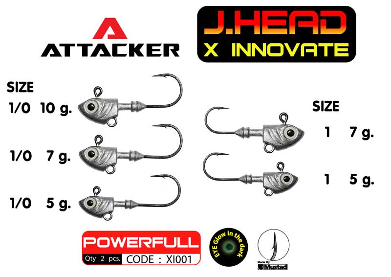 ATTACKER J.HEAD X INNOVATE รุ่น XI001 ออกแบบเบ็ดหัวจิ๊ก ให้เหมือนปลาขนาดเล็กซึ่งช่วยทำให้ปลาไม่ตกใจเมื่อเกิดการเหวี่ยงตัวเบ็ดออกและผิวสีเทาเงาให้เคลือบเรียบซึ่งจะช่วยเพิ่มความลื่นเบ็ดและลดการสะท้อนแสงเพื่อช่วยในการซ่อนตัวของตะขอเช่นกัน และยังเพิ่มการเรืองแสงของตาปลาด้วย มีให้เลือกตามลักษณะการใช้งานที่หลากหลาย ATTACKER J.HEAD X INNOVATE รุ่น XI001 จะช่วยให้คุณใช้งานได้ดีกับเหยื่อยางขนาดใด ๆก็ได้ทำให้การตกปลาเป็นเรื่องง่ายขึ้น