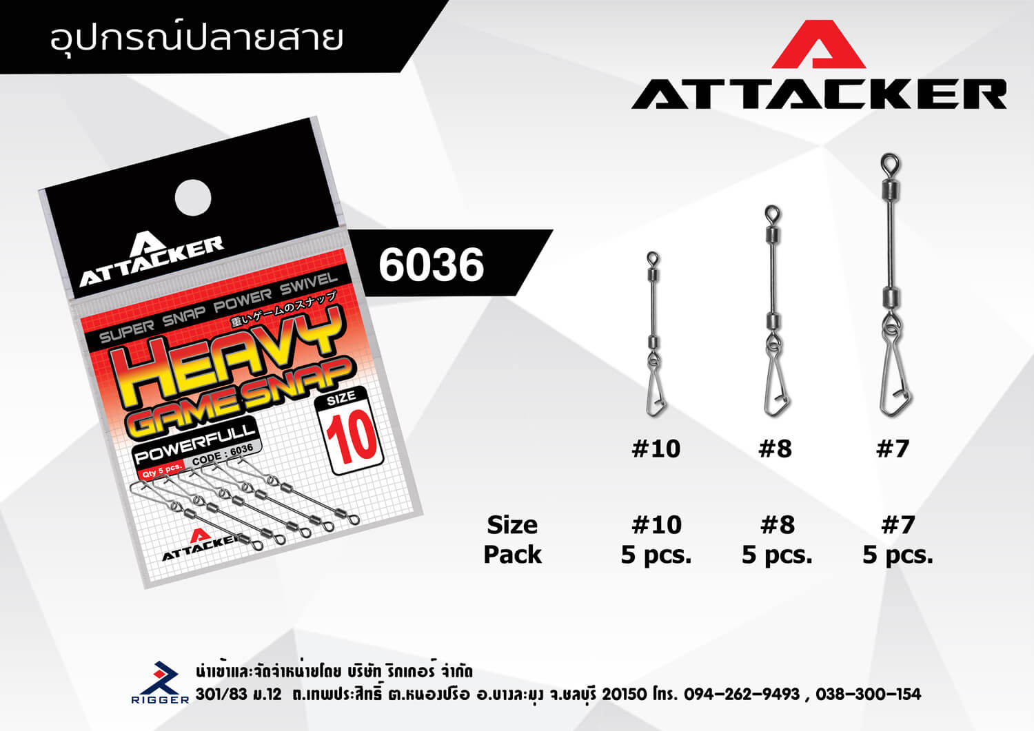 กิ๊ฟลูกหมุน ATTACKER HEAVY GAME SNAP รุ่น 6036 เป็นกิ๊ฟที่มาพร้อมแกนและลูกหมุน ที่มีความทนแรงดึงสูง ที่สามารถใช้งานได้อย่างครอบคลุม มีให้เลือกใช้กันตามขนาด ตามความต้องการในแต่ละงาน