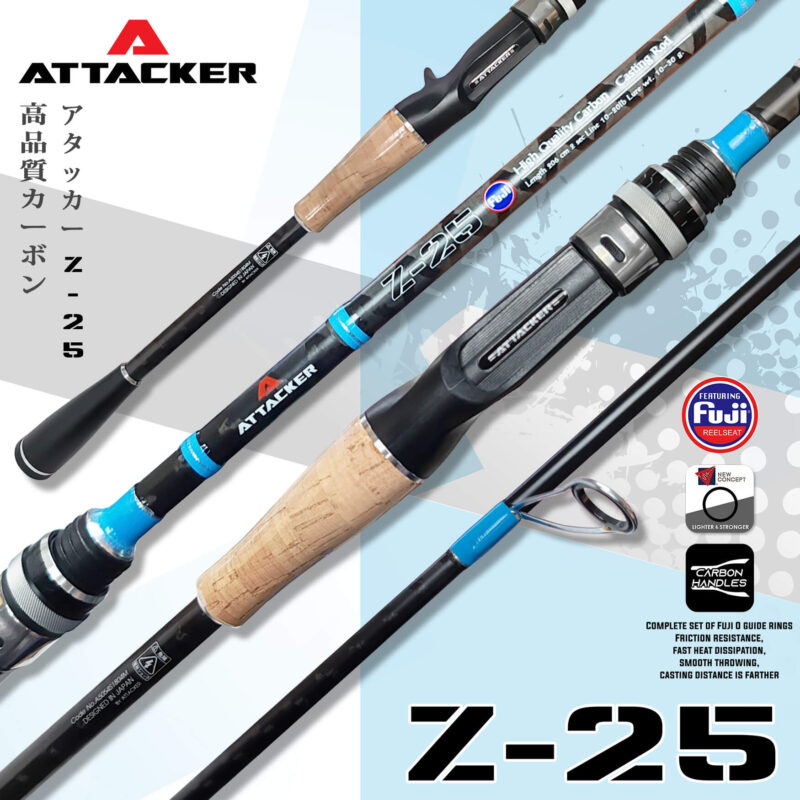 คันเบ็ดตกปลา คันตีเหยื่อปลอม ATTACKER รุ่น Z-25 คันตีเหยื่อปลอมใหม่สุดเทห์จาก ATTACKER ด้วยแบลงค์ลาย X-CROSS ที่มาพร้อมกับ Reel seat และ GUIDE FUJI ทั้งชุด ใช้งานได้อย่างมั่นใจ ขลิปสีฟ้าตัดแบลงค์สีดำทำให้คันดูโดดเด่นยิ่งขึ้น อีกทั้งยังเพิ่มความหรูหราด้วยด้ามจับไม้ก๊อก สามารถใช้ตกได้ตั้งแต่ งานตีเหยื่อปลอม ช่อน ชะโด ปลากราย ตลอดจนไปถึงการตกปลาทะเลก็ได้ ตัวคันลายผ้าแบบต่อกลาง ด้ามจับถนัดมือยิ่งขึ้น อีกทั้งส่วนปลาย Puddle ด้านท้ายรองด้วยยางเพื่อการใช้งานได้หลากหลาย เป็นคันเบ็ดตกปลาที่สายเหยื่อปลอมห้ามพลาดด้วยประการทั้งปวง!!