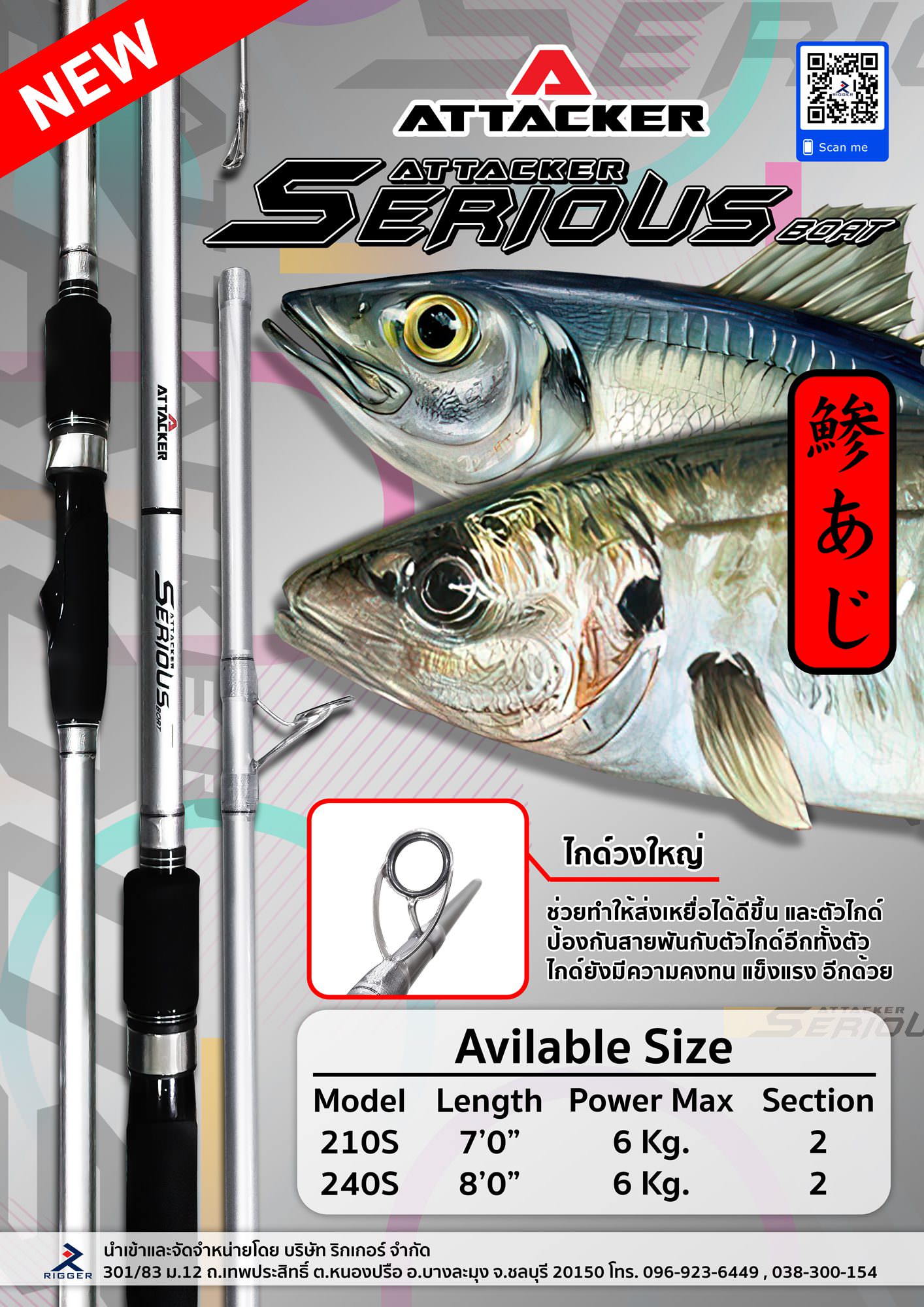 คันเบ็ดตกปลา คันอาจิ คันชายฝั่ง ATTACKER รุ่น Serious Boat แบบสปินนิ่ง ตัวคันเบ็ดมีความยาว ตัวแบลงค์คันแข็งแรงแต่ปลายอ่อน สามารถใช้ตกตั้งแต่ งานชายฝั่ง ตลอดจนไปถึงการตกปลาแบบอะจิ้ง (AJING) ก็ได้ ตัวคันสีขาวมุกสะอาดตาและหรูหราเรียบง่าย Reelseat จับกระชับถนัดมือยิ่งขึ้น อีกทั้งยังเพิ่มช่วงความยาวส่วน Puddle ด้านท้ายให้ความคล่องตัวและใช้งานได้หลากหลายขึ้น เป็นคันเบ็ดตกปลาในฝันของงานชายฝั่งเลยก็ว่าได้