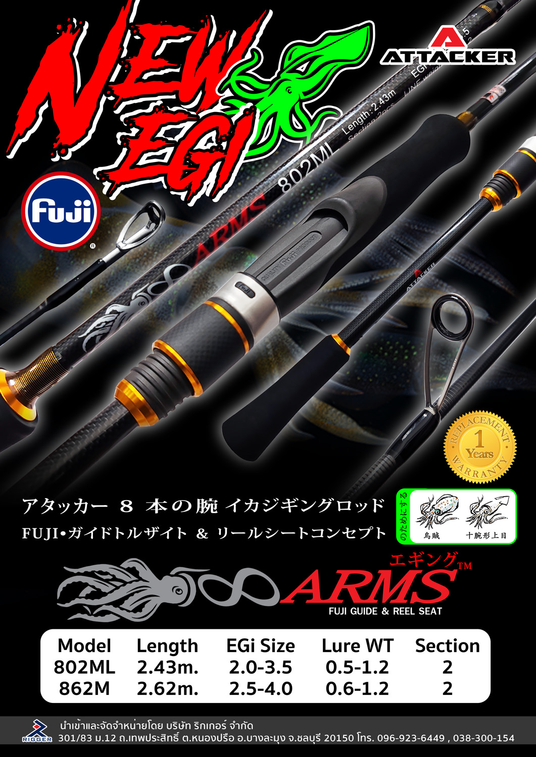 คันเบ็ดตกปลา คันเบ็ดตกปลาหมึก ATTACKER 8 ARMS ALL FUJI GUIDE & REEL SEAT คันเบ็ดตกปลาหมึก EGI-IKA I ที่ออกแบบมาอย่างลงตัว ด้วยวัสดุคาร์บอนกราฟไฟท์เกรดสูงให้การสปริงตัวสูง ส่งเซ้นส์รับเเรงเคลื่อนไหวใต้น้ำถึงข้อมือคุณได้ดีกว่าที่เคยด้วย FUJI GUIDE ที่แข็งแรงและทนทานยึ่งขึ้น ทำให้การตกปลาหมึกของคุณเปลี่ยนไปอย่างสิ้นเชิง หมดห่วงเรื่องการใช้งานและเต็มที่กับการวัดหมึกได้อย่างเต็มเหนี่ยว มีความยืดหยุ่นสูงและมีน้ำหนักเบา และเนื้อแบงค์ใช้วิธีการถักขึ้นรูปคาร์บอนเป็นลายเคฟล่าจนเกิดเป็นลายผ้าที่สวยงามพร้อมกับความแข็งแรงที่ช่วยในการผ่อนแรง และเพิ่มแอคชั่นในการบิดงอของคันเบ็ด ช่วยเพิ่มเซ้นส์ในการรับรู้และประสิทธิภาพในการเจิร์คปลาหมึกได้อย่างลงตัว และยังสามารถใช้ตกปลาเกล็ด หรือปลาชายฝั่งขนาดเล็กถึงกลางได้แบบสบายๆ