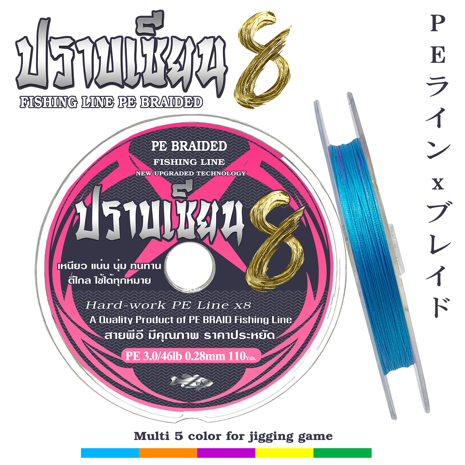 สายตกปลาพีอีถักแปด เป็นสายพีอีที่ได้รับความนิยมจากนักตกปลาเป็นอย่างมาก โดยเฉพาะนักตกปลาที่มีความชำนาญในการตีเหยื่อปลอมใต้น้ำนอกจากความเหนียวของสายและขนาดของสายแล้ว สายพีอีถักสี่ยังเป็นสายที่มีเสียงที่เบามาก ดังนั้นเมื่อนักตกปลาเหวี่ยงสายออกไป และสร้างแอคชั่นเหยื่อในน้ำแน่นอนว่าปลาจะไม่เกิดความระแวง อีกทั้งสายปราบเซียน 8 มัลติคัลเลอร์ เป็น สายที่เหนียว นุ่ม และลื่นสามารถใช้กับทุกสภาพการตกได้อย่างแน่นอน