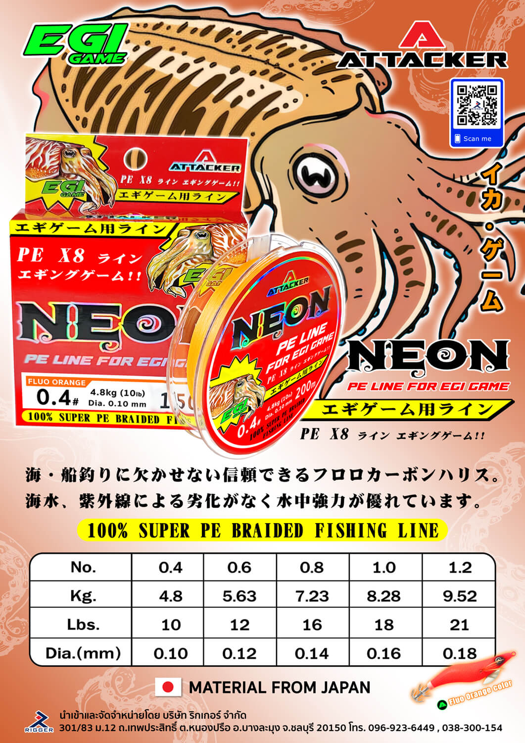 สายตกหมึก สายพีอี ถัก 8 ATTACKER NEON สีส้ม ขนาด PE 1.2 / 18lbs 150M