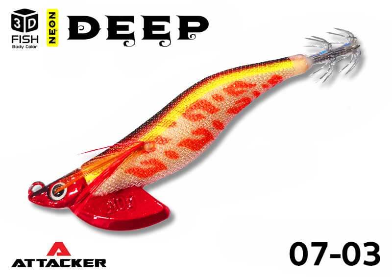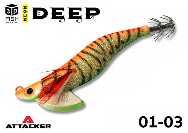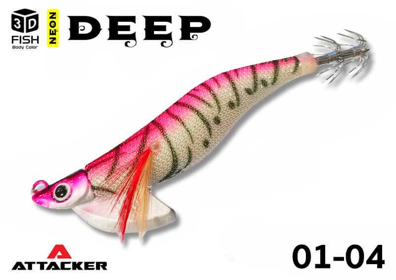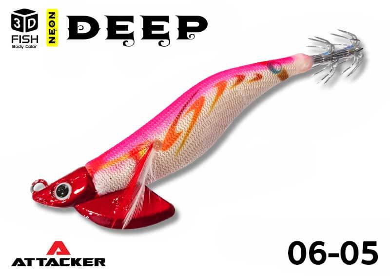 โยกุ้งเรืองแสง เหยื่อปลอมตกหมึก ATTACKER “NEON DEEP” ลำตัวออกแบบใหม่ด้วยลวดลาย 3D Fish body color สีติดแน่น ทนทาน เพิ่มการสะท้อนแสงจากลวดลาย ทำให้เกิดการเล่นแสงและดูสวยงามช่วยเพิ่มความสนใจของนักล่าเหมาะกับน้ำตื้นๆ 3-5 เมตร น้ำหนักดี จมไว เวลาเจิร์คออกแอคชั่นส่ายซ้าย – ขวา สามารถตกได้ทั้งชายฝั่งและในทะเล ลดอาการติดหินเพราะเวลาเจิร์คแล้วเหยื่อจะไม่ดิ่งลง เหมือนเหยื่อโยค่ายอื่นๆ ทำให้ ATTACKER NEON DEEP เป็นเหยื่อนักตกหมึกนิยมใช้อีกด้วย